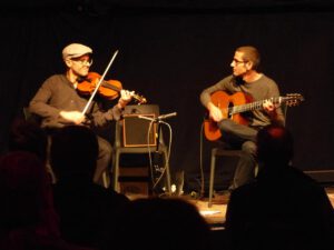 auf den zwei Saiteninstrumenten spannende Eigenkompositionen zwischenSwing, Bossa Nova, Samba, Valse Mussette und Jazz Manouche- Amerikanische